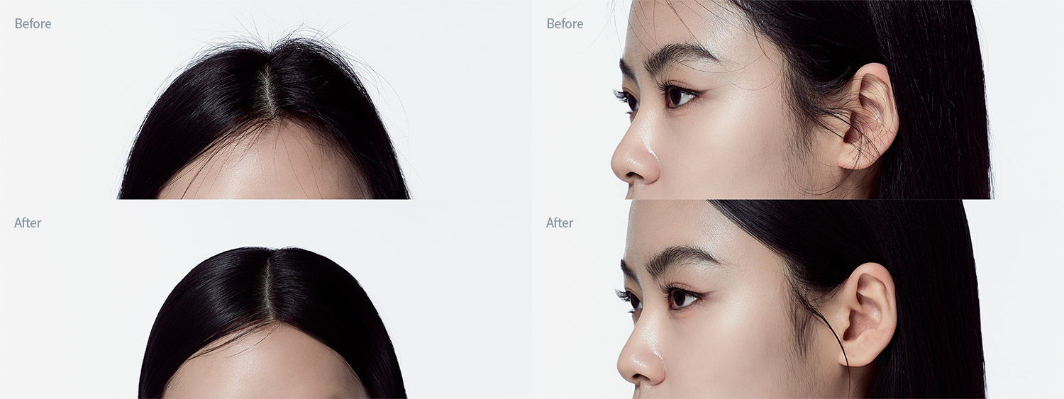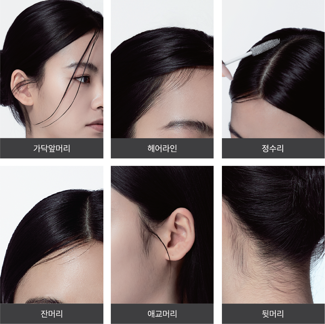 헤어라인 정돈 M자 이마나 빈 곳의 잔머리를 아래 방향으로 빗어 내려 깔끔한 얼굴 라인을 만듭니다.
